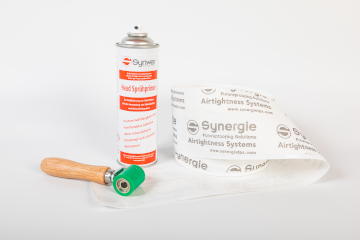 Application of this tape: Identify the surfaces to be sealed, making sure all surfaces are dry and free from dust and grease. We recommend the use of Synergie Spray Primer on porous surfaces. After cutting the tape to the desired length, remove the 12mm protective liner from the acrylic adhesive tape, apply the adhesive surface to the border of the window/door frame and press firmly with the Pressing Roller along the entire surface of the adhesive tape so that the glue bonds properly. Then remove the other split liners and place the adhesive side on the surface of the wall and press firmly with the pressing roller along the entire surface of the adhesive tape so that the glue bonds properly. Be extra careful to ensure you get a full bond to the substrate along the length and across the width of the adhesive tape, and that the tape lies fully flat along the substrate. If the substrate is uneven, particularly rough blockwork, then we recommend that any gaps that exist between the tape and the substrate are filled with a bead of Synergie adhesive paste, gently pressed down, to fill these gaps. Once the tape is fully bonded to the substrate it can be plastered over.